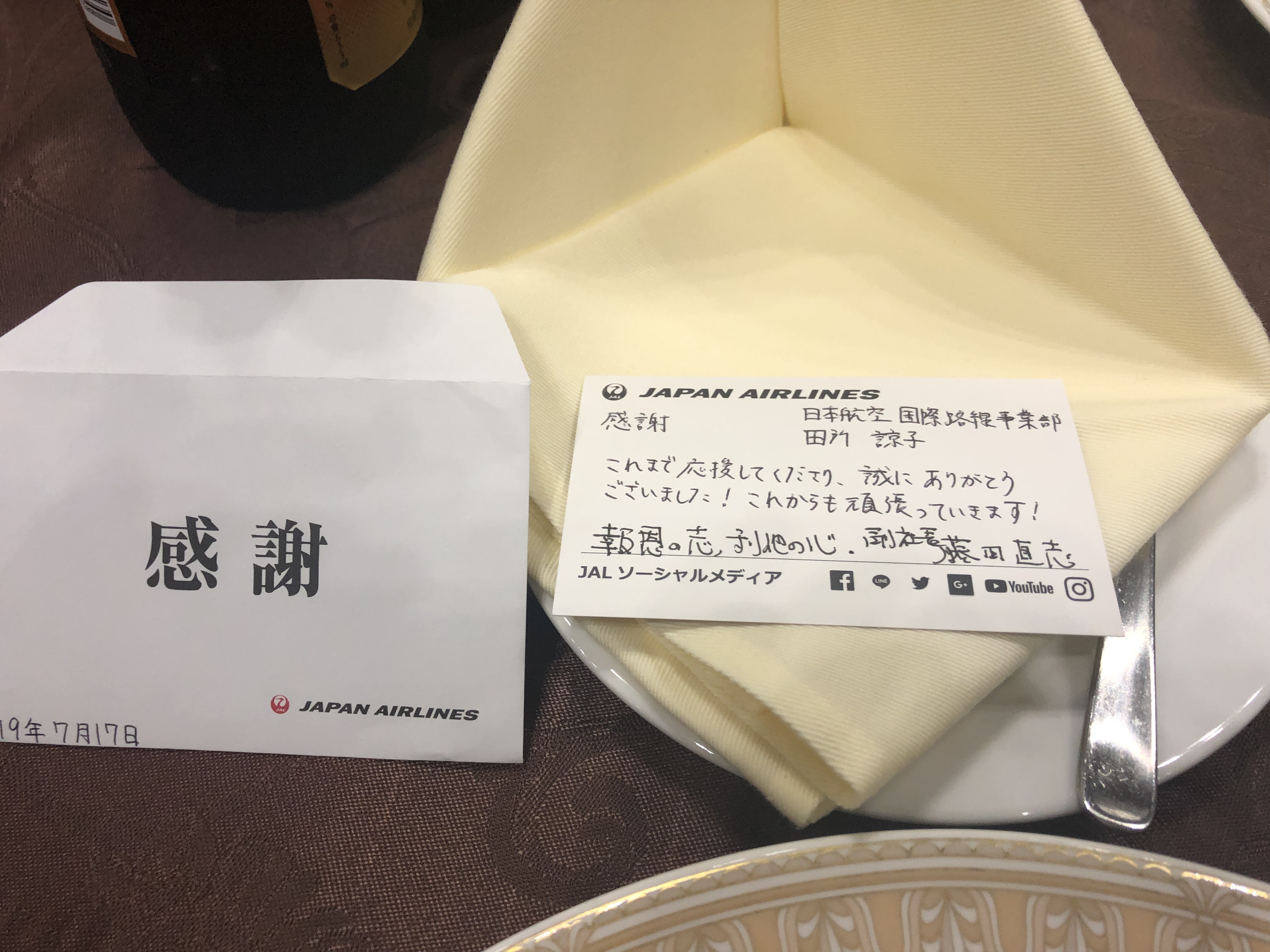 懇親会のテーブルには日本航空の方からの手書きのメッセージがありました感動しますね